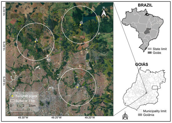 The study area at each chosen site was delimited by tracing a radius of 3 km from the place where ticks were collected from the environment (Figure 1). Site A corresponds to the school farm of the Veterinary and Animal Science School (EVZ) of the Federal University of Goiás (UFG) and to the neighborhoods close to the EVZ (16°35′37.3″ S, 49°16′53.5″ W, altitude 718 m); site B corresponds to the Vila Morais neighborhood and the set of neighboring residential neighborhoods, near the Meia Ponte river (16°39′31″ S, 49°13′8″ W, altitude 717 m); and site C corresponds to the peri-urban and rural areas close to the dam of the Ribeirão João Leite reservoir, which is located within the Altamiro de Moura Pacheco State Park (PEAMP), an integral protection conservation unit (16°34′09.2″ S, 49°12′51.2″ W, altitude 742 m).