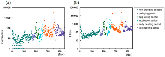 User attention based on different periods. (a) Number of comments on videos from different periods of kestrels. (b) Number of likes on videos from different periods of kestrels. Notes: Of the 536 related videos uploaded by Mr. Qin (as of 13 August 2021), more than 4/5 of them featured kestrels as the main character, and 441 of them could accurately determine the kestrel’s physiological cycle. We had reclassified these videos and plotted the number of comments and likes on the graph, with the X-axis representing the serial numbers of the classified videos. The figure was created by the authors using Excel.