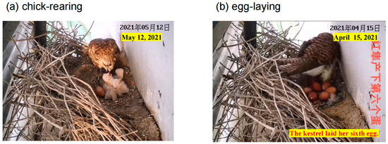 The mother kestrel’s chick-rearing (a) and egg-laying (b) behavior. Notes: The pictures were reproduced from the videos uploaded by Mr. Qin.