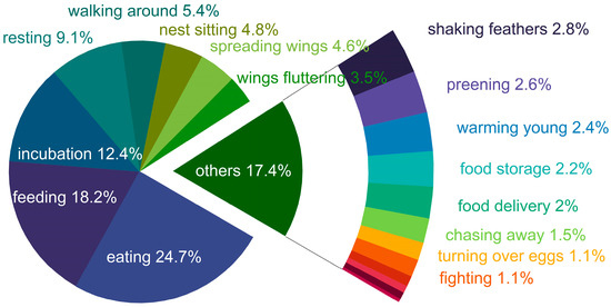 As Mr. Qin uploaded TikTok videos on the kestrels, users demonstrated more interest in these birds’ dynamic behavior (i.e., predating and chick-rearing) rather than their static nesting and hatching behavior. Based on our content analysis on user attention (Figure 1a,b), the kestrels received obviously less user attention in the non-breeding period. During its active breeding cycle, with the kestrels’ various behaviors of mating, hatching, and chick-rearing, there is a remarkable uptick in user attention and community discussion about the uploaded videos. Among them, the mother kestrel’s chick-rearing (Figure 2a) and egg-laying (Figure 2b) videos received the highest degree of user attention (3081 comments and 24,400 “likes”, 390 comments and 4222 “likes”, respectively). To attract even more user attention and “likes”, Mr. Qin released as many videos as possible about the kestrel’s chick-rearing through video editing and highlighted the kestrels’ diversified food sources and feeding movements in detail. Based on our data analysis (Figure 3), although Mr. Qin showcased many diverse behaviors and activities of the kestrels, and his videos included several rare and difficult-to-capture moments, such as the kestrels mating or fighting as well as their chicks’ defecation process (Figure S1), he still chose to prioritize the videos on their eating and feeding processes as the central theme in his account because these videos tend to attract the most user attention and “likes”. Therefore, users’ preferences can dictate the content production in these urban wildlife videos and as this user-preferred content gains momentum through more “likes” and sharing, TikTok’s data algorithms will pick up these popular videos and recommend them to even more people who may be interested in these videos. This, in turn, propels the creation and expands the growth of virtual communities interested in urban wildlife and their daily routines.