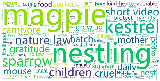 A word frequency analysis was conducted to study the influence of these TikTok wildlife videos on their users. From the word cloud analysis (Figure 4) and the word frequency count (Table S1), it can be seen that user perception of urban wildlife has evolved around the intertwined relationships between wild animals and non-human elements (i.e., magpie, kestrel, sparrow, mouse, prey, predation, food chain, lay eggs, hatch, survival, occupy, and so on). There was also interest in wildlife conservation (i.e., protect, nature, laws of nature, illegal, second-class protected animals, intervention), sentiments towards wildlife (i.e., gratitude, expect, cruel, and selfless), how social media was represented (i.e., short video, live show, camera lens, etc.) and post-video watching behavior (i.e., applaud, moved, hope, release, etc.). Next, we integrated our empirical findings and textual data to further explore social media users’ perspectives on urban wildlife.