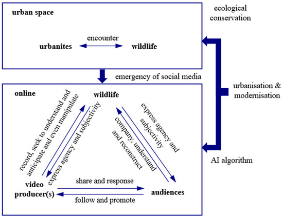 In this case study, accordingly, we propose the general pattern of human–urban wildlife relationships in social media (as shown in Figure 5). The video producer, influenced by the audiences’ interests and preferences and wildlife initiative, constantly adjusts and changes his practice and decision-making. The audiences constantly input, output, and reconstruct the information about wildlife in the interaction with the video producer, and promote the wildlife video operations of the video producer through feedback and reflection. Wild animals’ practice is often independent of human’s understanding and anticipation. The AI algorithm also becomes a key factor in influencing knowledge production with its calculative recommendations in amplifying attention on the highlights of the wildlife videos.