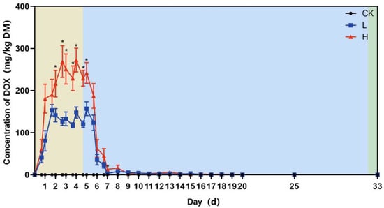 The concentration of doxycycline in pig feces. The bars represent the standard error. The * indicates that the concentration of doxycycline in group H is significantly different from it in group L (p < 0.05). The medication period was defined as 0–4 days for 5 days in total (light yellow color), and the withdrawal period was defined as 5–32 days for 28 days in total (blue color). The 33rd day was the first day after the withdrawal period (green color).