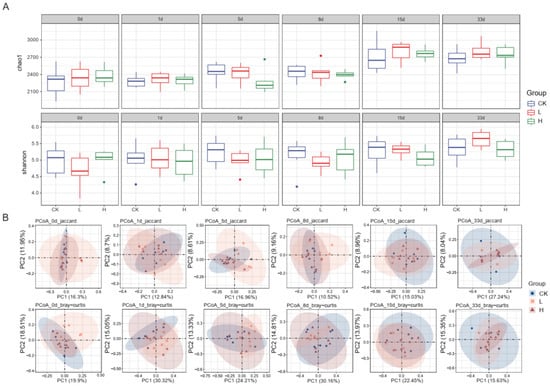 (A): The α-diversity of the bacterial community, including Shannon and Chao1 indexes in pig feces; the two indexes of each group on days 15 and 33 were significantly increased compared to on days 0, 1, 5 and 8 in each group (p < 0.05). (B): The β-diversity of the bacterial community in pig feces by PCoA based on binary Jaccard distance and Bray–Curtis distance; the confidence ellipse was set at the 95% level based on the β-diversity of samples on the same day.