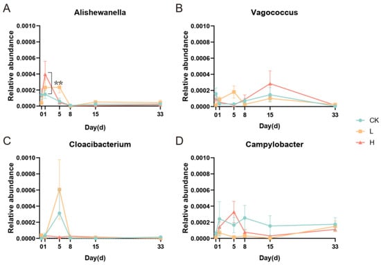 The relative abundance of four bacteria significantly associated with doxycycline concentration (** represents p < 0.01). The four bacteria were Alishewanella (A), Vagococcus (B), Cloacibacterium (C), and Campylobacter (D).