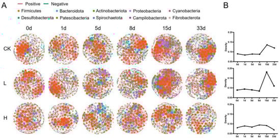 (A) Bacterial cooccurrence network depicting Spearman’s correlation coefficient based on the levels of bacterial genera (|r| > 0.8, p < 0.05). Nodes represent bacterial genus. The colors indicate the phyla to which they belong, and the sizes indicate the degree of genera, which means the number of connections with other nodes. Edges represent significantly positive (red) or negative (green) correlation, and the widths of edges indicate the Pearson’s correlation coefficient (|r|); (B) network density in different groups during the whole experiment.