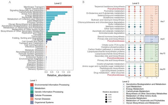 The relative abundance of KEGG level 1, level 2, and level 3 pathways in the three groups according to PICRUSt2 function prediction. (A) The bar plot was generated with the relative abundances of all the level 2 pathways, and different colors represent different level 1 metabolic pathways. (B) Bubble plots based on the relative abundance of significantly different level 3 metabolic pathways in different groups at different days (p < 0.05). The size of the bubble represents the relative abundance of pathways, while the color indicates the level 2 pathway to which it belongs. The prenyltransferases pathway was marked red text colour. The symbol * indicates that the relative abundance of the level 3 pathway in this group was significantly downregulated (↓) or upregulated (↑) when compared with that in group CK (* represents p < 0.05, ** represents p < 0.01).