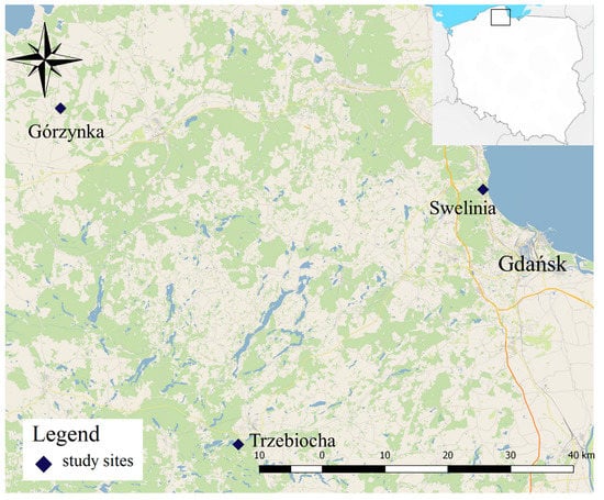 We conducted the study in the Pomeranian Lakeland and the Baltic Sea Coast, Northern Poland. The area comprises mostly young, postglacial landscapes, and the land cover is dominated by a mosaic of arable land and meadows (~50%), forests, mostly managed and composed predominantly of Scotch pine (Pinus sylvestris), beech (Fagus sylvatica), and pedunculate oak (Quercus robur) (~36%), and human settlements (~6%). A dense network of lakes and small rivers covers ~5% of the region. Three small rivers were chosen as study sites (Figure 1):