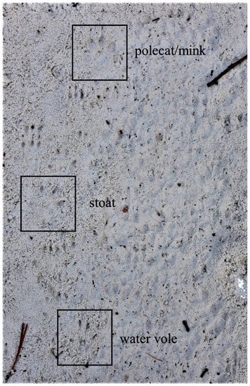 We identified the activity of at least five species of mammals. Among them, at least three of them represented the order Carnivora (European polecat Mustela putorius or American mink—Figure 3; the stoat Mustela erminea—Figure 3 and Figure 4); one larger rodent (water vole Arvicola amphibius—Figure 3 and Figure 5; in one case, similar tracks could also belong to the brown rat Rattus norvegicus); however, most of them were small rodents, or Soricomorphs, which could not be identified and were therefore classified into the collective category of small mammals, micromammalia (Figure 4).