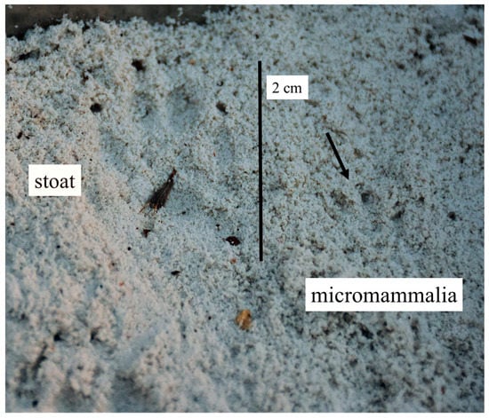 Single track of a stoat compared to that of an unidentified small rodent or shrew, classified into the collective category of micromammalia (arrow indicates claw imprints) (photo by Z. Wikar).