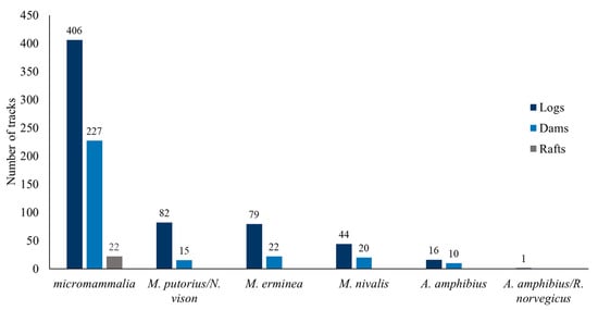 Animal tracks left in kinetic sand were identified to the lowest possible taxon using identification keys [,,]. All tracks were counted because it was impossible to separate individual tracks, and due to the occurrence of single tracks, activity was measured by the number of all paw prints. Due to the significant loss of tracking tunnels and consequent reduction in sample size, we merged the data from all three sites. By multiplying the length of the exposure and the number of tunnels in the given categories (dams, logs, and rafts), we obtained the number of trap days, which was used to calculate the average number of tracks.