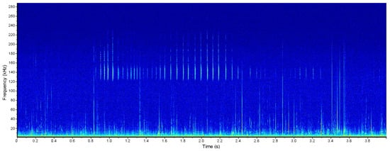 Humpback whales are commonly known for their singing, made up of repeated series of complex vocalizations [8]. They also produce vast repertoires of non-song social calls. Males sing during the breeding season, whereas both males and females produce social calls when in groups of three or more adults [9]. The fundamental frequency of sounds produced by humpback whales ranges between tens of Hz and 4 kHz, with higher harmonics extending beyond 24 kHz [10]. Minke whales in the North Pacific produce unique vocalizations (commonly referred to as boings) during their breeding season from fall to spring [11]. The fundamental frequencies of boings ranged between 1 and 1.8 kHz, with harmonics extending to approximately 9 kHz [12]. Killer whales produce broad-band echolocation clicks up to 85 kHz, whistles between 1.5 kHz and 18 kHz, and pulse calls that appear tonal but are a rapid series of pulses with peak energies between 1 and 6 kHz [13,14,15]. East Asian finless porpoises produce narrowband high-frequency echolocation clicks well over 100 kHz that can be easily identified from other bio- and abiotic sounds [16].