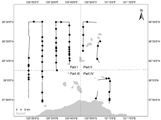 Survey routes (black line) and acoustic detection location (black dot) for the East Asian finless porpoises in Miaodao Archipelago waters in May 2021.