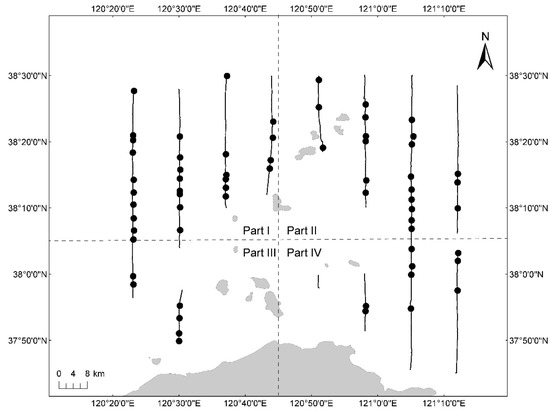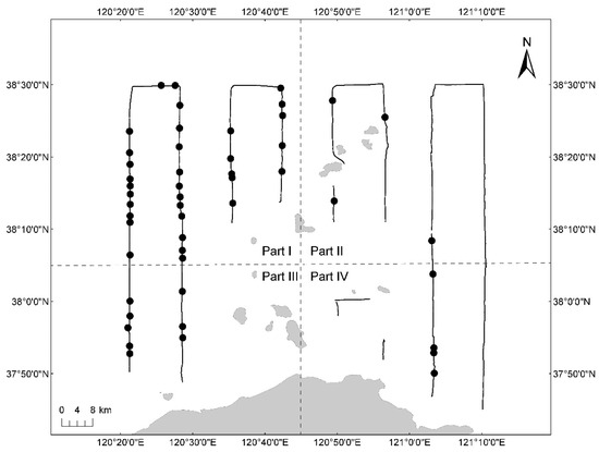 Survey routes (black line) and acoustic detection location (black dot) for the East Asian finless porpoises in Miaodao Archipelago waters in July 2022.