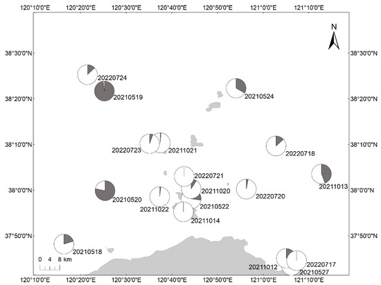 Map showing the proportions of the duration of porpoise acoustic detection in each site (dark in pie charts) in Miaodao Archipelago waters in May 2021, October 2021, and July 2022.