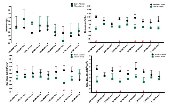 Haematological parameters of oscar fed experimental diets containing different levels of FM and exposed to secluded early mild stress for ten weeks plus data related to after acute confinement stress (AC stress). Values are represented by means and SDM of triplicate samples. Hash (#) with red colour indicates the significant difference in each treatment before and after AC stress according to the independent sample t-test (p < 0.05).