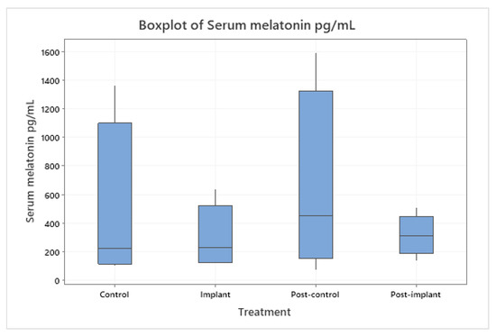 Boxplot of serum melatonin in the control (n = 4) and the treatment (n = 5) groups. Control/Implant refers to samples collected on the day of implant or sham implant. Post-control/Post-implant refers to blood samples collected at one time-point 8–30 days after the Control/Implant samples. There were no significant differences between the groups (p > 0.05).