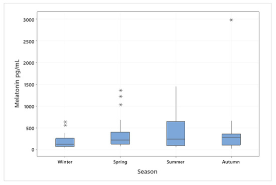 Boxplot of serum melatonin in different seasons. There were n = 9 bitches and 121 observations. There were no significant differences between seasons (p > 0.05). * represent outliers.