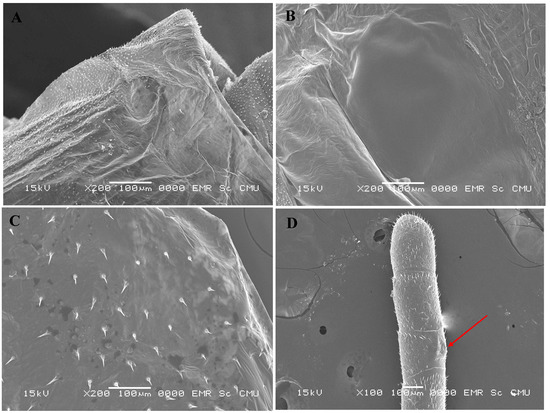Scanning electron microscope pictures of A. mellifera tissues. (A) The abdomen of a purple-eyed pupa, (B) the abdomen of tanned-bodied pupa, (C) the wing of the crippled adult honey bee, and (D) the antenna of the crippled adult honey bee. The red arrow points to the scar of the antenna.