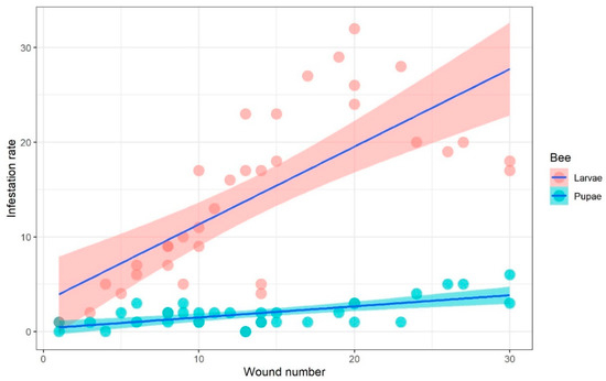 A significant relationship between mite infestation rate and injury numbers was observed for both bee larvae and pupae (Table 1). The infestation rate increased as the number of injuries increased for both larvae and pupae (Figure 2). The overall mean infestation rate was 14.26 ± 8.87 (n = 35) for larvae and 1.91 ± 1.44 (n = 35) for pupae. The infestation rate was significantly higher in larvae than in pupae (t = 8.126, df = 68, p < 0.001).