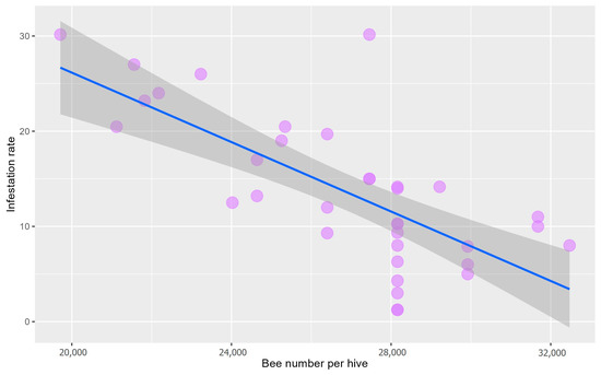 The relationship between Tropilaelaps mercedesae mite infestation rate and honey bee population (honey bee number) per beehive. Purple circles represent the infestation rate for each bee population size. Blue solid lines with gray loess curves show the significant relationship between mite infestation rate and bee population using linear regression.