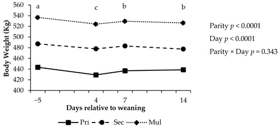 Analysis of the cows’ BW showed that there was no interaction (p = 0.343) between parity and evaluation day (Figure 1). On average, multiparous cows presented a higher BW (p < 0.0001; SEM [Standard error of means] = 17.45), followed by secundiparous and primiparous cows. The BW of the cows changed according to the day of evaluation (p < 0.0001), with the lowest average BW observed just after the weaning.