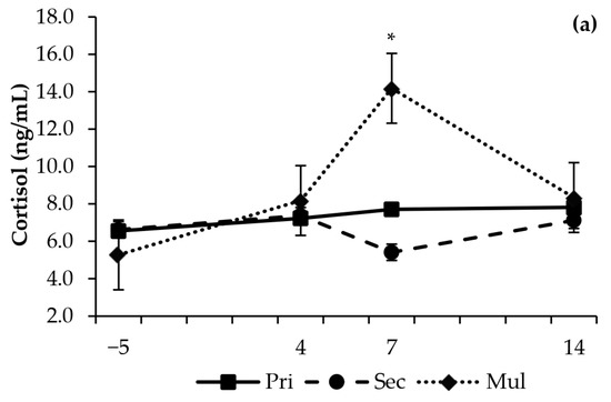 For RBC count, there was an interaction (p = 0.014; 0.27) between parity and evaluation day (Table 2). Differences between parity orders were detected on d + 4, whereby higher RBC counts were observed for multiparous cows (Figure 4a) compared with secundiparous and primiparous cows, which did not differ from each other. An interaction was also observed (Table 2) between parity and evaluation days for HCT percentage (p = 0.009; SEM = 0.75). Differences between parity orders were detected on all post-weaning collection days (Figure 4b), with higher values being observed for multiparous cows than for primiparous cows. In addition, on d + 4 and d + 14, HCT values were higher for multiparous cows than for secundiparous cows. However, HCT values were only higher for secundiparous cows compared to primiparous cows on d + 7. Analysis of HB concentration also revealed an interaction (p = 0.034; SEM = 0.29; Table 2) between parity and evaluation day. On all post-weaning collection days, HB concentration (Figure 4c) was higher for multiparous cows than for primiparous cows.