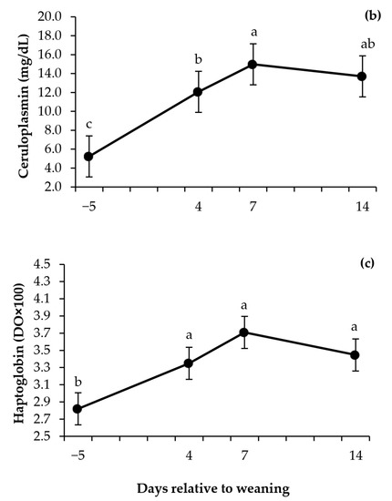 Analysis of serum cortisol concentrations in the blood revealed an interaction (p = 0.038; SEM = 1.03) between parity and evaluation day (Table 2). Furthermore, differences between parity orders were detected (Figure 2a) on d + 7, with higher cortisol concentrations detected in multiparous cows than in the other parity orders, which were similar to each other (p > 0.05). However, effects of day, but not parity or parity and day, were detected for ceruloplasmin (p < 0.0001; SEM = 0.99; Table 2) and haptoglobin concentrations (p < 0.0001; SEM = 0.58; Table 2). In addition, ceruloplasmin (Figure 2b) and haptoglobin (Figure 2c) concentrations increased post-weaning and did not return to pre-weaning values on d + 14.
