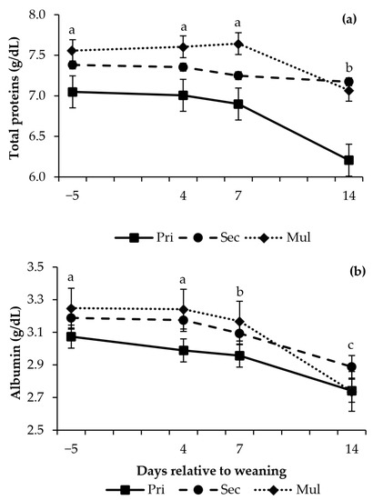 Figure 3. Total proteins (a) and albumin (b) serum concentrations in Nellore cows with different parity under grazing according to the days relative to weaning. Days with different superscripts differ from each other for all parity orders (p < 0.05).
