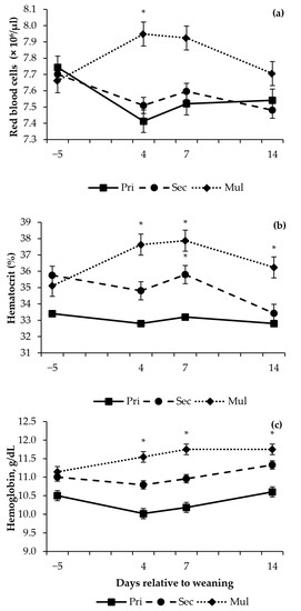 Figure 4. Red blood cell number (RBC; (a)), Hematocrit percentage (HCT; (b)), and hemoglobin concentration (HB; (c)) in Nellore cows with different parity under grazing according to the days relative to weaning. On days with asterisks (*) there is a parity x day interaction (p < 0.05).