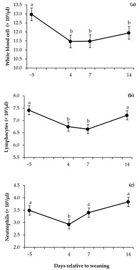 Figure 5. White blood cell number (WBC; (a)), lymphocyte number (b), and neutrophil number (c) in Nellore cows with different parity under grazing according to the days relative to weaning. Days with different superscripts differ from each other for all parity orders (p < 0.05).