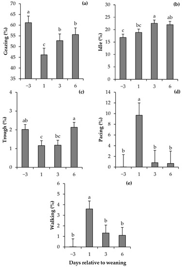 Figure 6. Grazing (a), idle time (b), trough time (c), pacing (d), and walking (e) in Nellore cows under grazing according to the days relative to weaning. Days with different superscripts differ from each other (p < 0.05).