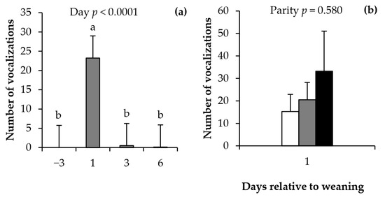 Figure 7. The number of vocalizations recorded in Nellore cows under grazing according to the days relative to weaning (a) and in primiparous (white), secundiparous (grey), and multiparous cows (black) on d + 1 after weaning (b). Days with different superscripts differ from each other (p < 0.05).