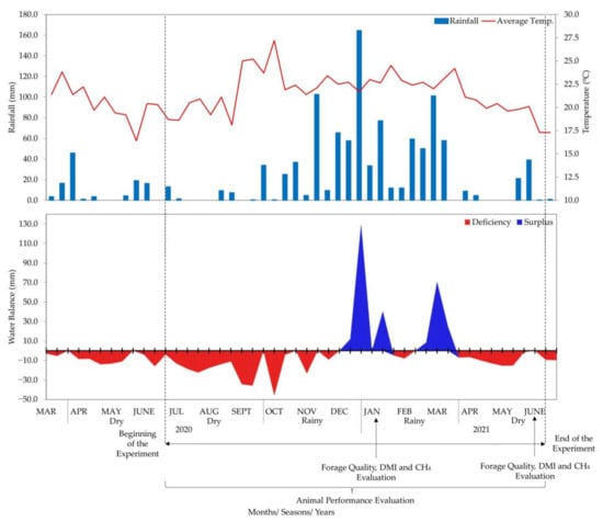 During the experimental period that lasted from July 2020 to July 2021, samples for assessing forage quality, dry matter intake (DMI) and CH4 emissions were collected in two seasons: rainy (January) and dry (July). For performance evaluations, the animals were monitored monthly, and the average daily gain (ADG) data was grouped into dry (July–September 2020 and April–June 2021) and rainy (from October 2020 to March 2021) seasons. In the dry season, the average temperature was 20.4 °C and the average cumulative rainfall was 156 mm, while during the rainy season the average temperature was 22.9 °C and the average cumulative rainfall was 868 mm according to the climatic data obtained from an automatic weather station located near the experimental site (http://www.cppse.embrapa.br/meteorologia/index.php?pg=automatica accessed on 23 August 2021) (Figure 1).
