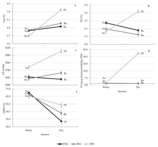Treatment affected CP, NDF and ADF, while NDF was also affected by the different seasons (p < 0.05). When compared to DEG and REG, the MIX treatment presented 45 and 25% greater values of CP (p = 0.0016). Additionally, MIX presented approximately 12% lower values of NDF (p = 0.0013) and 14% lower values of ADF (p = 0.0012) compared to the other treatments. During the dry season, a 10% lower value of NDF was found compared to the rainy season (p = 0.0004). The decomposition of the treatment × season interactions is present in Figure 2. Similar results of EE, CT and DMD were found among the treatments during the rainy season (Figure 2b,d,e) (p > 0.05). However, during the dry season, greater values of these variables were found for MIX compared to the REC and DEG treatments (Figure 2b,d,e) (p < 0.05). During both seasons, MIX presented greater values of GE compared to the REC and DEG treatments (Figure 2c) (p = 0.0343). The Lig content in the MIX treatment was lower in the rainy season and greater in the dry season compared to REG and DEG (p < 0.0001) (Figure 2a).