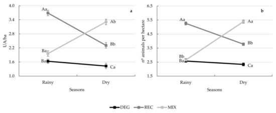 Decomposition of the treatment × season interaction for stocking rate expressed as UA per hectare (a) and as number of animals per hectare (b) in the different pasture-based systems during the experimental period. Different capital letters indicate statistical differences among treatments in the same season, while different lowercase letters indicate statistical differences between seasons for each treatment by Fisher’s test (p < 0.05). Vertical bars represent the standard error of the means.