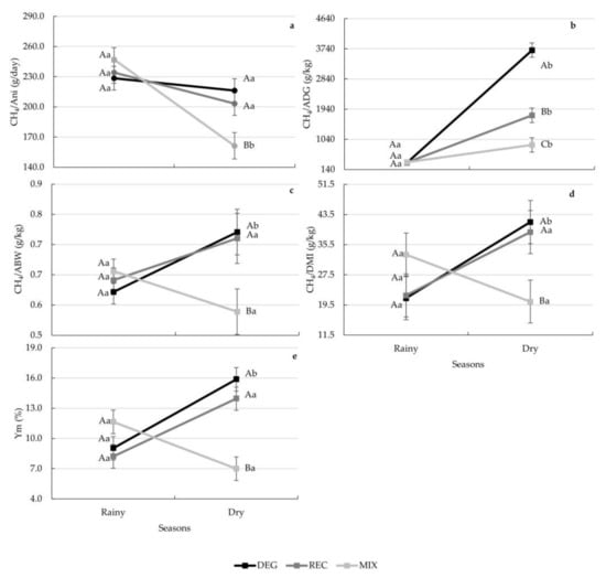 Interactions between season and treatments were found for the enteric CH4 emission parameters and Ym (p < 0.05) (Figure 4a–e). No differences among treatments were found in the rainy season of the experimental period (p > 0.05). During the dry season, lower values of enteric CH4 emissions and Ym were found for MIX compared to both the DEG and REC treatments (p < 0.05) (Figure 4a–e). Additionally, during the dry season, lower emissions of CH4 per ADG were found for REC compared to the DEG treatment (p > 0.05) (Figure 4b). In comparison to the DEG treatment, there was a reduction in CH4 emissions in the MIX treatment of up to 70% when expressed per ADG during the dry season of the experimental period (3699.62 vs. 873.04 g CH4/kg ADG; Figure 4b).