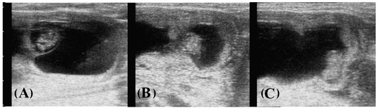 Only cows in their third lactation or more carrying live bilateral twins (one embryo in each uterine horn) with two CL (one CL in each ovary) were included in this experiment. Primiparous and secundiparous cows were excluded because twins are much more common in cows in their third lactation or more [25,26,27], and the pregnancy loss rate is similar among cows with a parity of three or more [42,43]. The length of each embryo was measured on a frozen ultrasound frame using the electronic calipers of the ultrasound machine, and measurements were adjusted to the nearest one mm. As the embryo initially had the appearance of a straight line which developed a C shape on day 25 and an L shape on day 33 [35], the length of the long axis of the embryo visualized in a dorsoventral plane was recorded as the length of the embryo proper. For twins of different lengths, the length differential was defined as the percentage of difference with respect to the larger embryo. We assumed the larger embryo to be male and the smaller one to be female [1,2,3,37]. In these pregnancies, larger and smaller embryos were alternately ruptured on a weekly rotational basis, and fetal sex was determined from days 56 to 62 of gestation [44,45,46] in the pregnancy confirmation exam. Finding a size differential cutoff for the sexing of twins in the heterosexual group was the first objective of the present study. In the remaining pregnancies, in which a length that was differential between twins was not detected, the embryo located in the right uterine horn was ruptured. All cows received 1250 mg flunixin meglumine plus 100 µg GnRH immediately before or after reduction to promote the maintenance of gestation [15]. For induced twin reduction, the rupture of the amniotic vesicle of a twin embryo was guided by ultrasound and carried out by applying manual pressure. The amniotic vesicle was held and pressed with the thumb and half to cause a rupture (Figure 1). The time lapse between the vesicle subjection and the rupture was no longer than five seconds, and the cows did not show any sign of discomfort. Embryo death was assessed by the cessation of the heartbeat and was observed by ultrasound. All procedures of twin reduction were performed by the same operator.