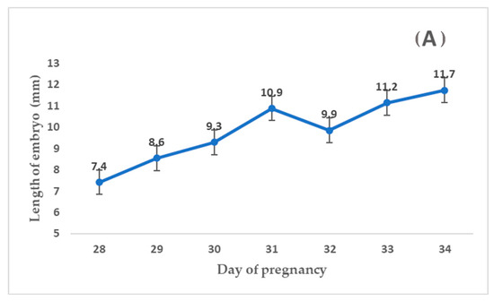 In single pregnancies, factors such as parity (heifers versus parous cows), milk production, body condition score, circulating hormones and metabolites, insemination number, the sire of the embryo, and the horn of pregnancy could not be associated with embryo size during the late embryonic period [37,38]. Therefore, our second objective was to compare growth patterns in twins with established growth standards for singleton pregnancies. As embryo measurements were taken only once between 28 and 34 days of pregnancy, only apparent rates of growth for twin pairs from day 28 to 34 of the pregnancy and embryo measurements for each day of pregnancy were compared to the growth standards for singletons. Examining the possible effects of individual embryo measurements and days of gestation on pregnancy loss rates was this study’s third objective. Two unplanned appraisals were initiated during the course of this study. Once a clear cutoff was observed, which allowed for the sexing of twins), the apparent growth rate for female and male embryos was included in the second objective, whereas the embryo gender of the heterosexual twins was examined as part of the third objective.