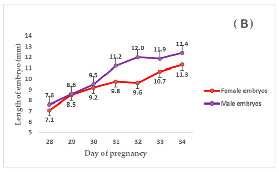 Mean lengths (±S.D.) for the total sample of co-twins. (A) n = 184 for male and female embryos. (B) n = 90 from day 28 to 34 of pregnancy.