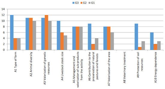 For the “A5 Management and Valorization of By-Products from the Activity” indicator, group G3 obtains a score approaching the maximum, this is due to their structured use of forage cultivation. As a result, they use and valorize livestock manure to fertilize cultivated plots and also valorize wool.