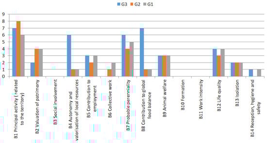 For this scale, scores are rather mediocre for all three groups, with a slight positive difference in favor of G3, which is ensured by the “Employment and Services” components as well as the “Ethics and Human Development” component. However, in general, we can retain the same explanations for the three groups. All three groups are penalized by the three components of the scale. The “Quality of Products and Territories” component aims to promote the development of livestock farming that uses and respects the natural environment through appropriate practices while maintaining the authenticity of the landscape, with the aim of finding a balance between production and preservation of territories. However, groups G1, G2, and G3 are very far from achieving this expected balance. G1 scores 30/100, G2 scores 27/100, and G3 scores 36/100, because nearly 90% of all surveyed farms practice fattening in parallel with their breeding activities. This fattening activity is based on the use of concentrated feeds such as barley, corn, and soybeans, among others, which can be classified as an activity outside the soil. Consequently, this system is penalized by indicator B1, which favors local production well adapted to its natural and social environment (Figure 7).