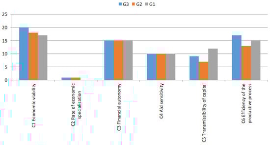 However, some indicators have a very low score, such as “C2 Economic Specialization Rate”, with a score of G1 0/20, G2 1/20, and G3 1/20. The farms in G1 and G2 are characterized by a mono-production, and as a result, they suffer from the negative effects of climate disturbances and market fluctuations (Figure 8).