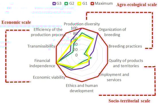 Graphical representation of the sustainability scores of different groups of livestock farmers based on agroecological, socio-territorial, and economic indicators.