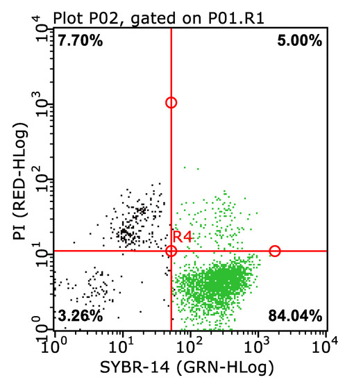 An example of a dot plot with live spermatozoa indicated by green dots in the Experimental group in the lower right quadrant (84.04%): SYBR+PI- (SYBR, SYBR-14; PI, propidium iodide).