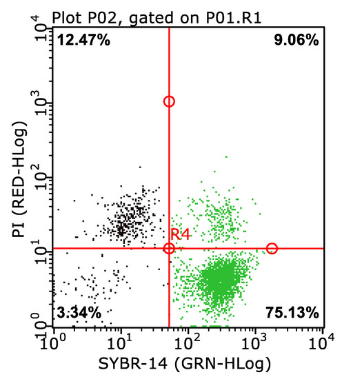An example of a dot plot of live spermatozoa indicated by green dots in the Control group in the lower right quadrant (75.13%): SYBR+PI- (SYBR, SYBR-14; PI, propidium iodide).