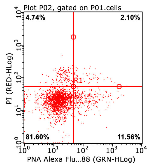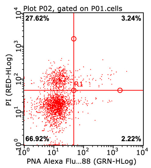 An example of a dot plot with live spermatozoa with intact acrosomes in the Experimental group in the lower left quadrant (81.6%): PNA- PI- (PNA, PNA Alexa Fluor 488–lectin from Arachis hypogaea; PI, propidium iodide).