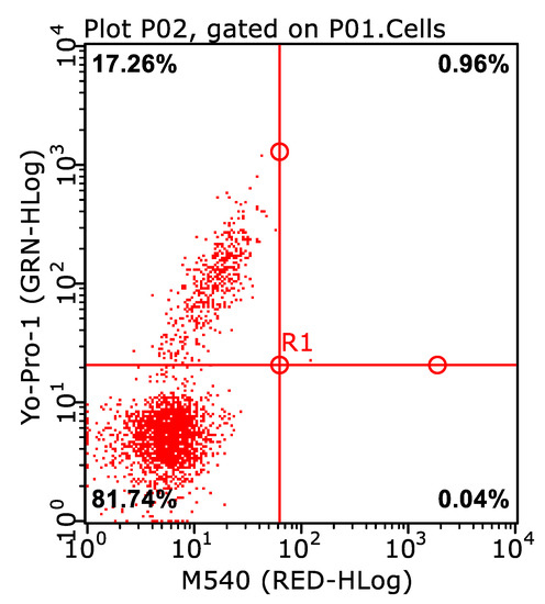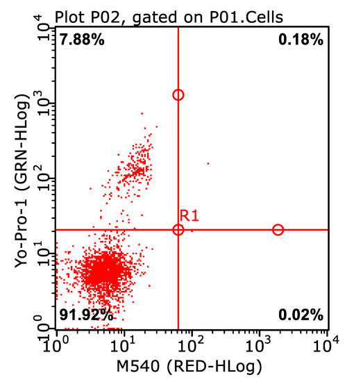 An example of a dot plot with live spermatozoa without destabilized membranes in the Control group in the lower left quadrant (81.74%): Mer-/Yo-Pro-1- (Merocyanine 540 (M-540) assessing capacitation-related membrane destabilization; YO-PRO-1 assay for apoptosis evaluation).