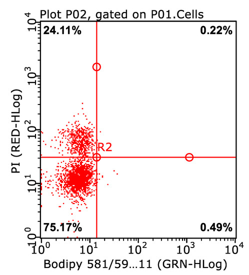 An example of a dot plot with live spermatozoa without lipid peroxidation in the Experimental group in the lower left quadrant (75.17%): PI-/BODIPY- (PI, propidium iodide; BODIPY, fluorescent membrane probe).