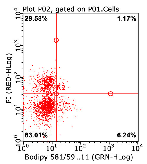 An example of a dot plot with live spermatozoa without lipid peroxidation in the Control group in the lower left quadrant (63.01%): PI-/BODIPY- (PI, propidium iodide; BODIPY, fluorescent membrane probe).